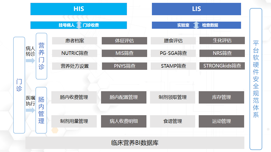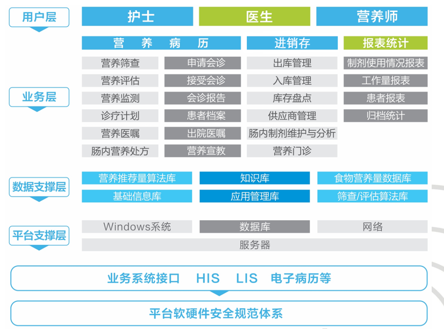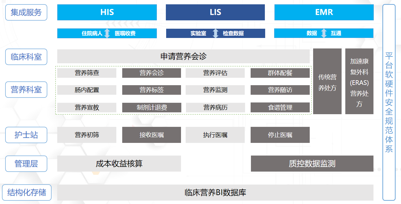 评估医院信息化进程,梳理科室个性化需求,利用系统化、智慧化医疗服务手段,携手医院共建临床营养诊疗管理平台,积极推动新医改时代下智慧医院建设。